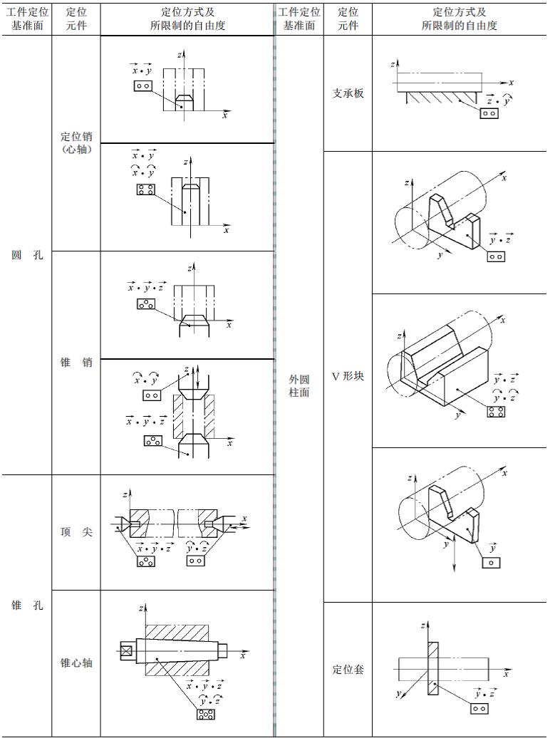 如果重復限制相同自由度的定位支承點之間存在嚴重的干涉和沖突,以致造成工件或夾具的變形,從而明顯影響定位精度,這樣的過定位必須嚴禁采用。表1-1列舉出了常見典型定位方式及其定位分析情況。
